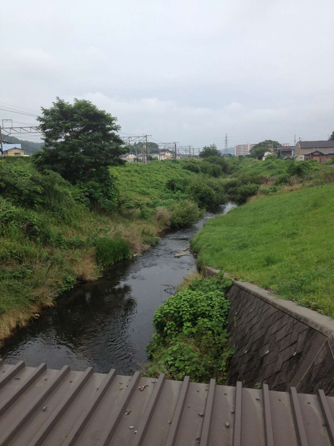橋の上から下流方向へ写真撮影。手前は、橋よりの落下転落用のシェードなんですかねえ?最近出来たようですが、設置目的(理由)が分かりません。しかし、川べりは草が大量に生い茂っています。