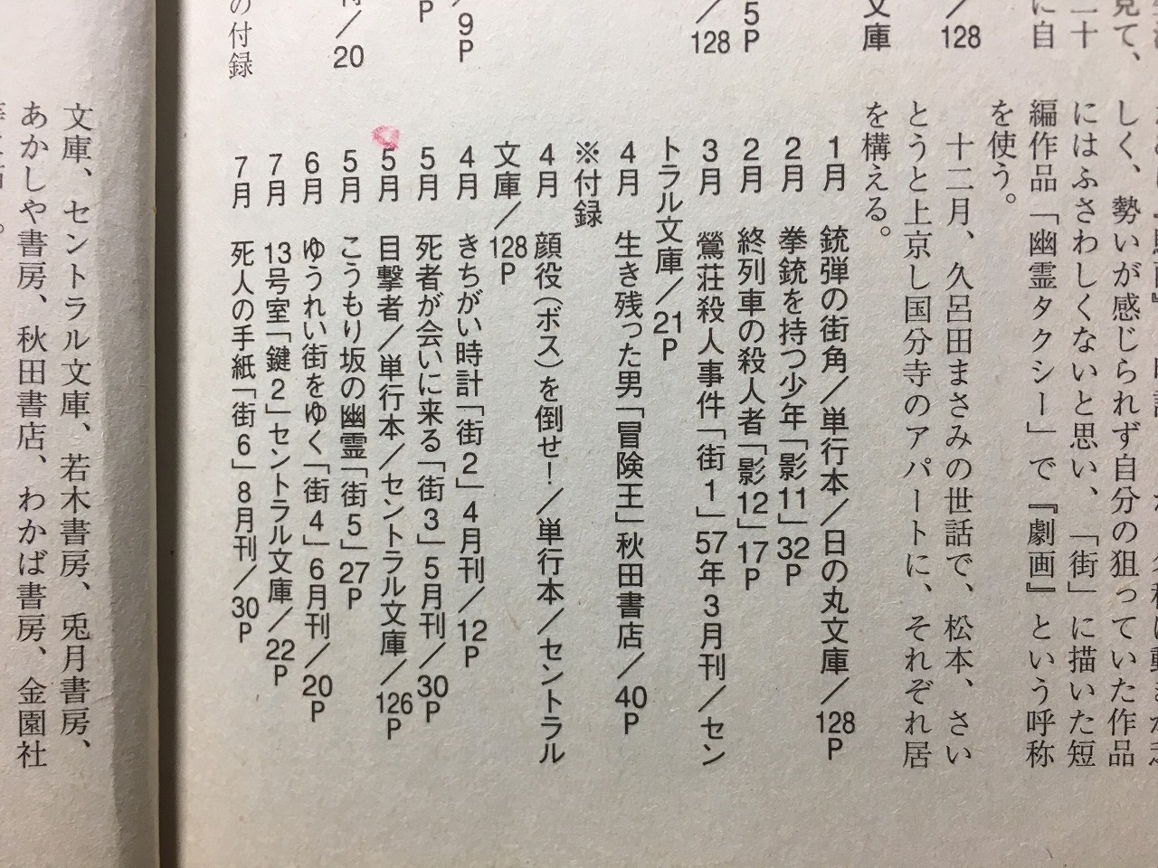 青林工藝舎 大発見巻末の年譜の、1957年5月 にある「目撃者/単行本 セントラル文庫/126pがこのebookJapan電子書籍の目撃者に相当するかと思われます。 一般的に流布している辰巳ヨシヒロが、「劇画」という用語を初めて使用したとされる、『幽霊タクシー』街12/29p/セントラル文庫/58年2月刊 (この年譜では1957年12月のところに記載)より半年ほど早い時期の頃になる。